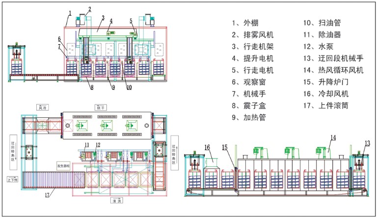 上件滾筒段、 清洗段、迂回轉角段、烘干爐段、風冷段、吊籃及電器控制系統(tǒng)組成。